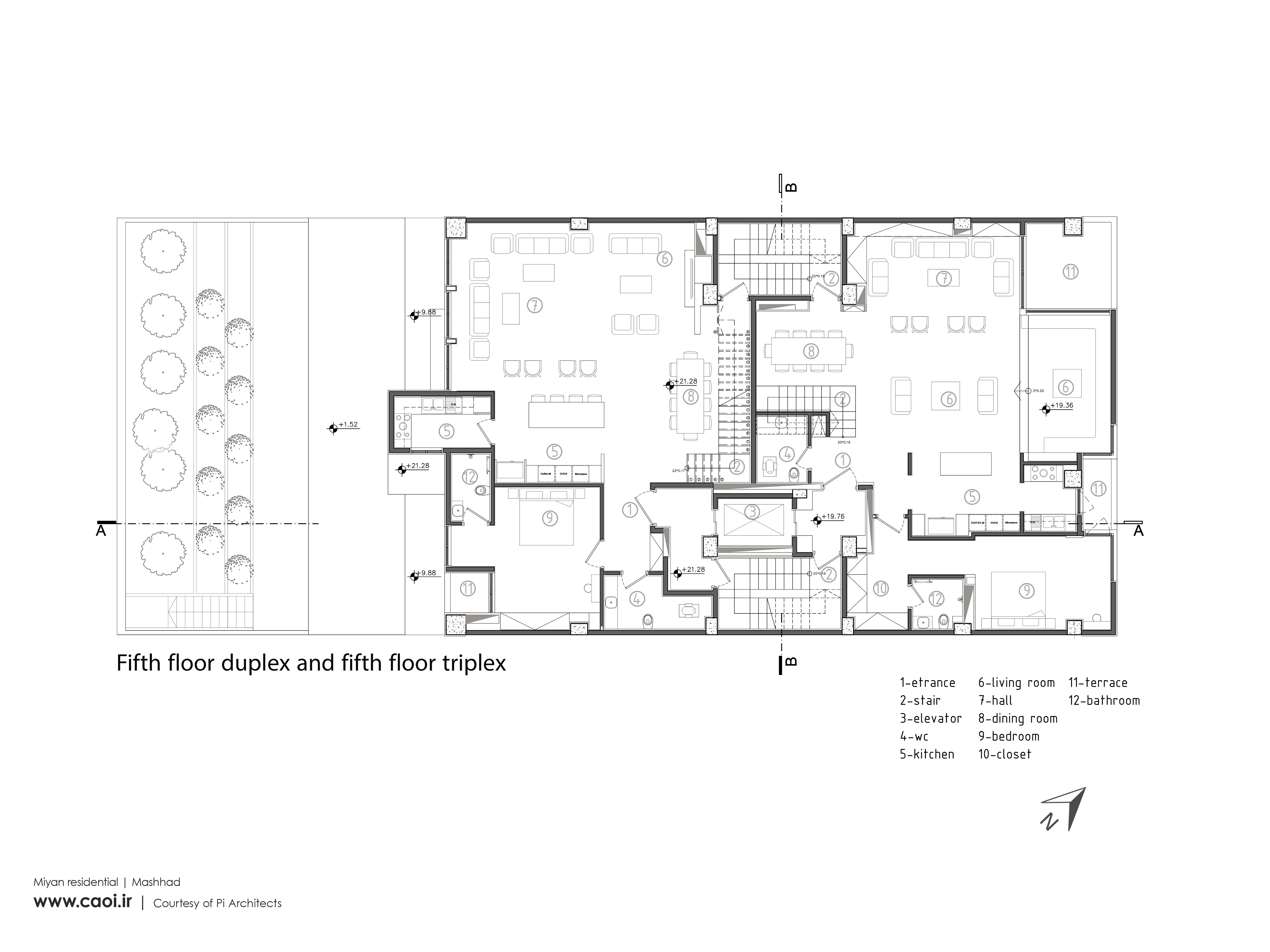 بنا از پنج تیپ پلانی متمایز تشکیل شده که هر کدام کیفیت فضایی خاص خود را دارند. این تنوع پلان، در عین حفظ انسجام کلی پروژه، به کاربران امکان انتخاب از میان گزینه هایی با سازمان فضایی متفاوت را میدهد؛ انتخابی که فراتر از صرفاً متراژ، بر پایه تجربه فضایی و زیست فردی شکل می گیرد. یکی از ویژگی های شاخص این پروژه، ایجاد شکست در فرم، حجم و سازهی ساختمان از میانه آن است. این تصمیم در طراحی نه تنها به تعریف بهتر فضاهای داخلی کمک کرده، بلکه باعث شکل گیری واحدهایی با یک میان طبقه (دوبلکس) در دو واحد و یا دو میان طبقه (تریبلکس) در یک واحد و در سه واحد دیگر با ساختاری شکسته شده است.